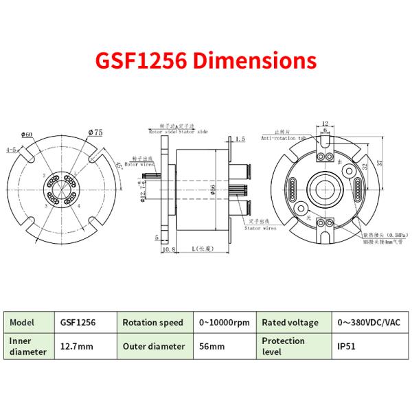 The GSF1256 series flanged high-speed slip rings feature a 12.7mm center hole and a 10,000 rpm rotational speed. They are designed for small to medium-sized, high-speed applications requiring end-mounting. The flange design enhances mounting security and minimizes rotational offset.